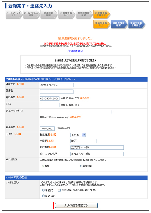 ご予約時の資料配布先や旅行会社からのご連絡をご自宅以外にする場合は、〔ご連絡先住所〕の入力が必要となります。
